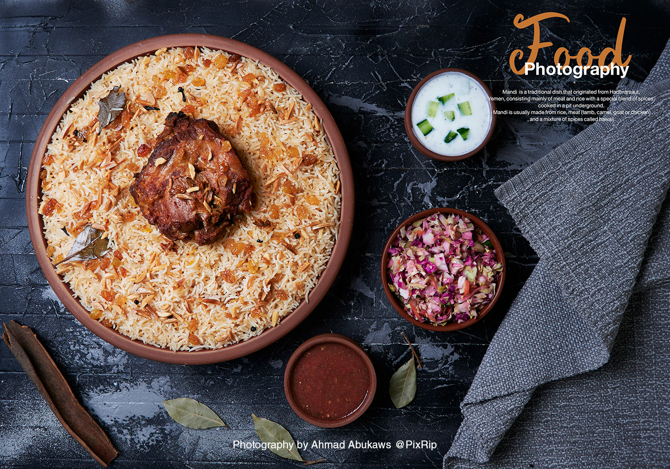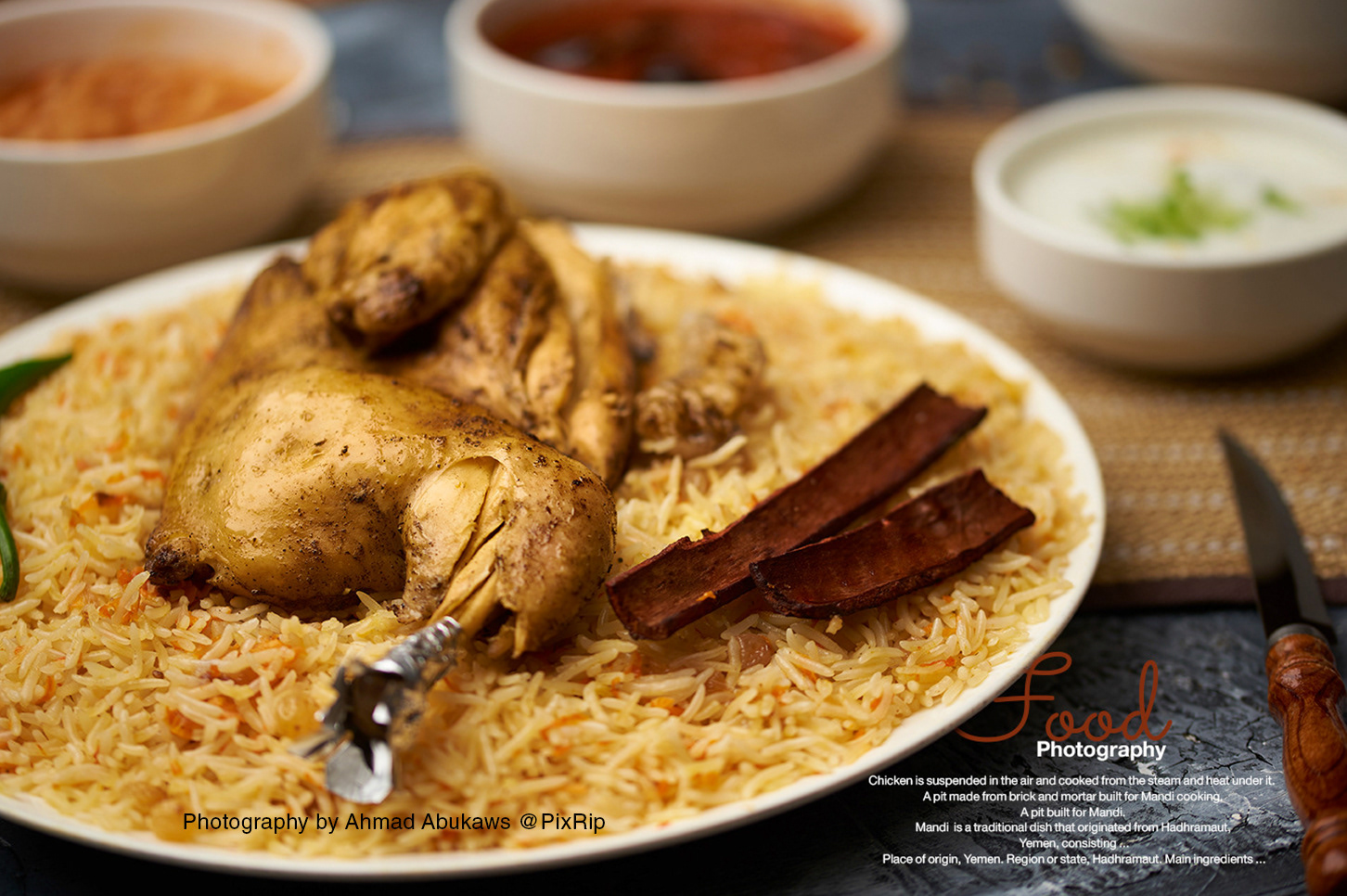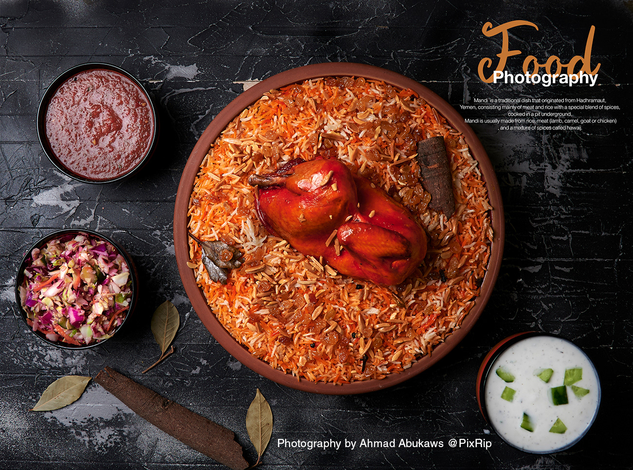 Food photography for a Yemeni mandi restaurant, focused on traditional rice and meat dishes with warm lighting and dark backgrounds. The shoot highlights authenticity, texture, and appetite appeal, ideal for menus, social media, and brand identity